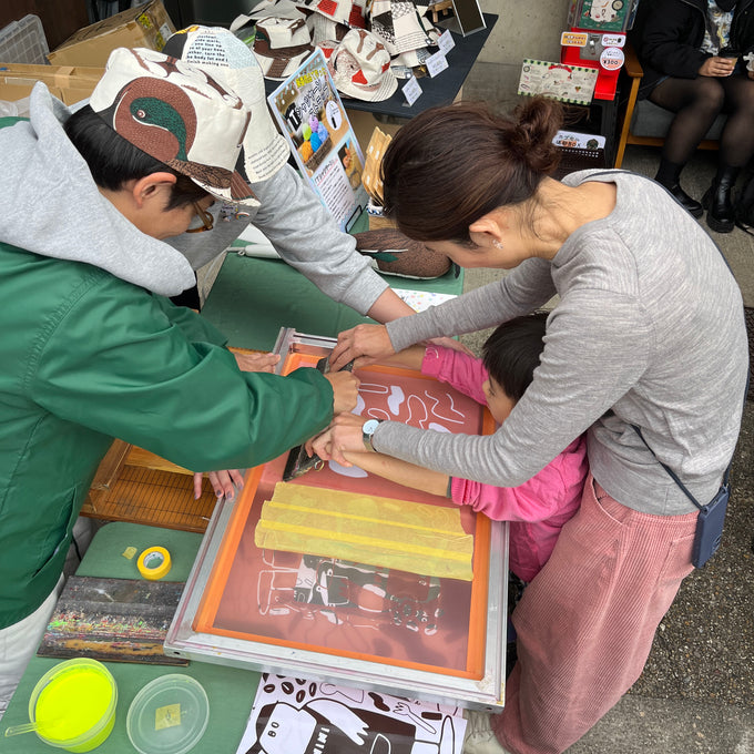 カフェやクラブ、ギャラリーなど屋内でのイベントスペース、近年増えつつあるマルシェ、アートイベントなど野外での催事イベントに出張してプリント体験をしていただいております。普段作業するプリント工場を飛び出して、一期一会の出会いとお客さまとの会話を大切にして行なっております。ご興味がある方々もお気軽にお問い合わせいだければ幸いです。